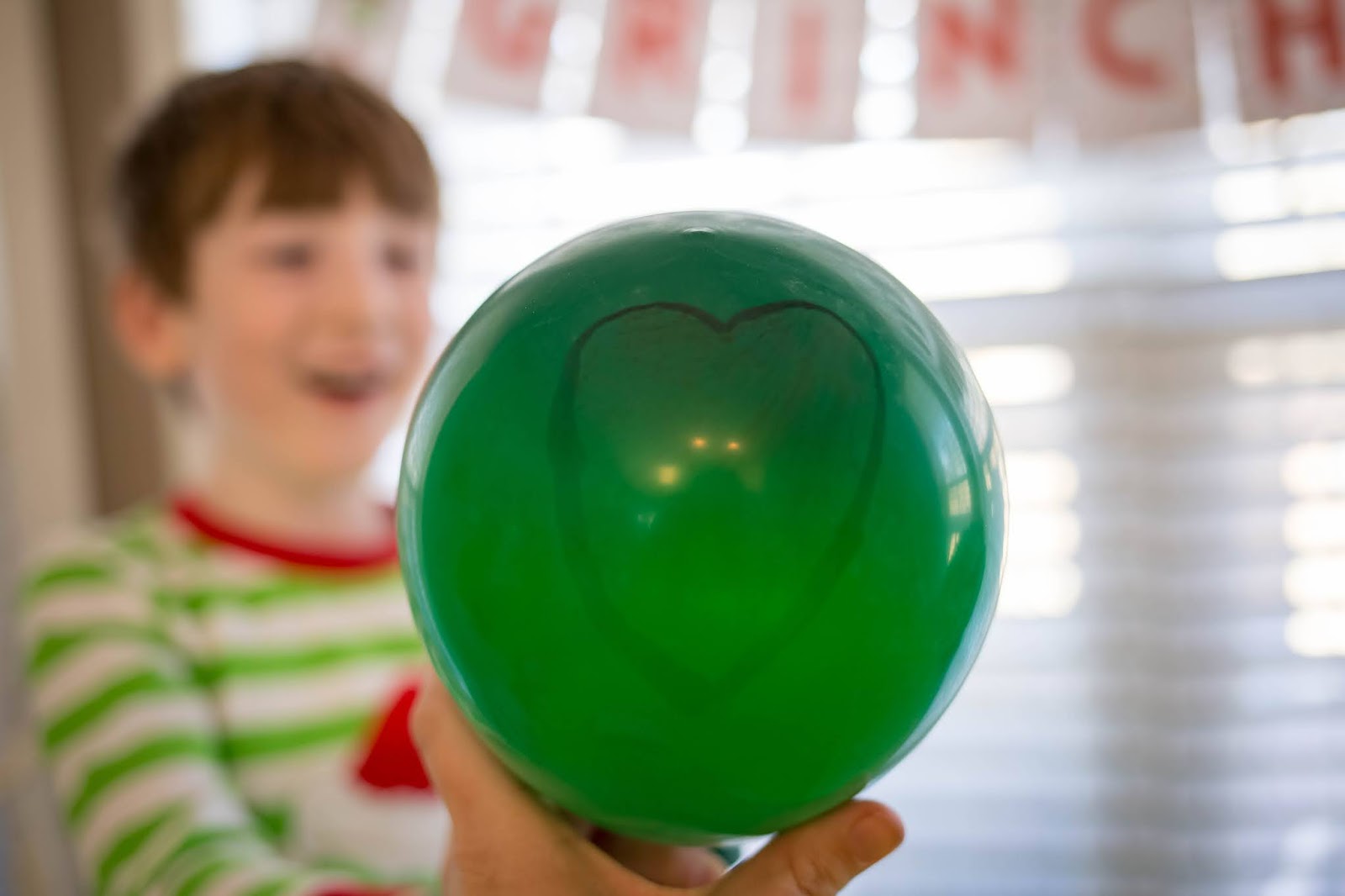 I set up a little the day before. I hung a banner, we got these cute little Whoville trees from Sprouts, and I made a balloon garland Whoville tree! The balloon garland was actually super simple. I blew up balloons, threaded a big sewing needle with fishing line, and ran the fishing line through the tied end of the balloon after I’d blown them up. To get it to stay on the wall, I used a few command hooks. I just looped the fishing line around the hook a couple of times to make sure it was secure. To add in the “ornaments” I blew up the balloons a lot smaller, and used glue dots to stick them in between the bigger green ones.